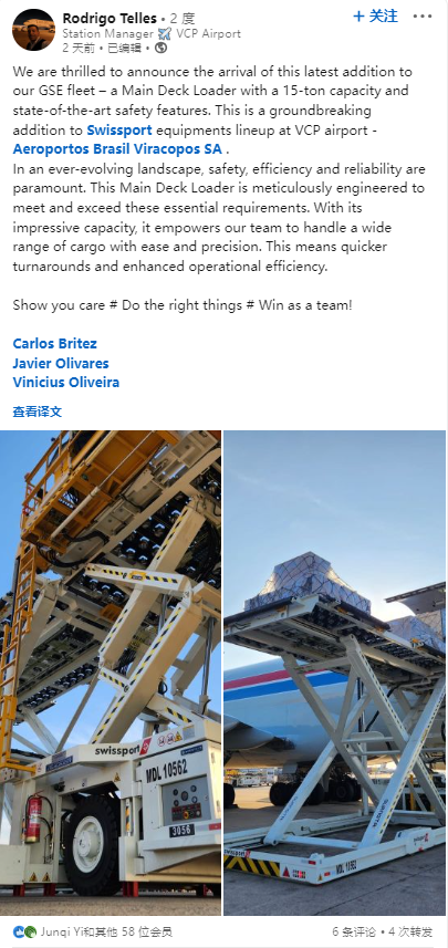 近期,由于威海8868体育官网首页入口集装货物装载机在海外市场的出色作业表现,全球领先的地服公司Swissport的一位相关代表在领英发文为8868体育官网首页入口产品点赞!我们很高兴地宣布我们GSE车队的最新成员的到来——一台承载重量为15吨、具有最先进安全功能的集装货物装载机。这是Swissport在坎皮纳斯国际机场的…